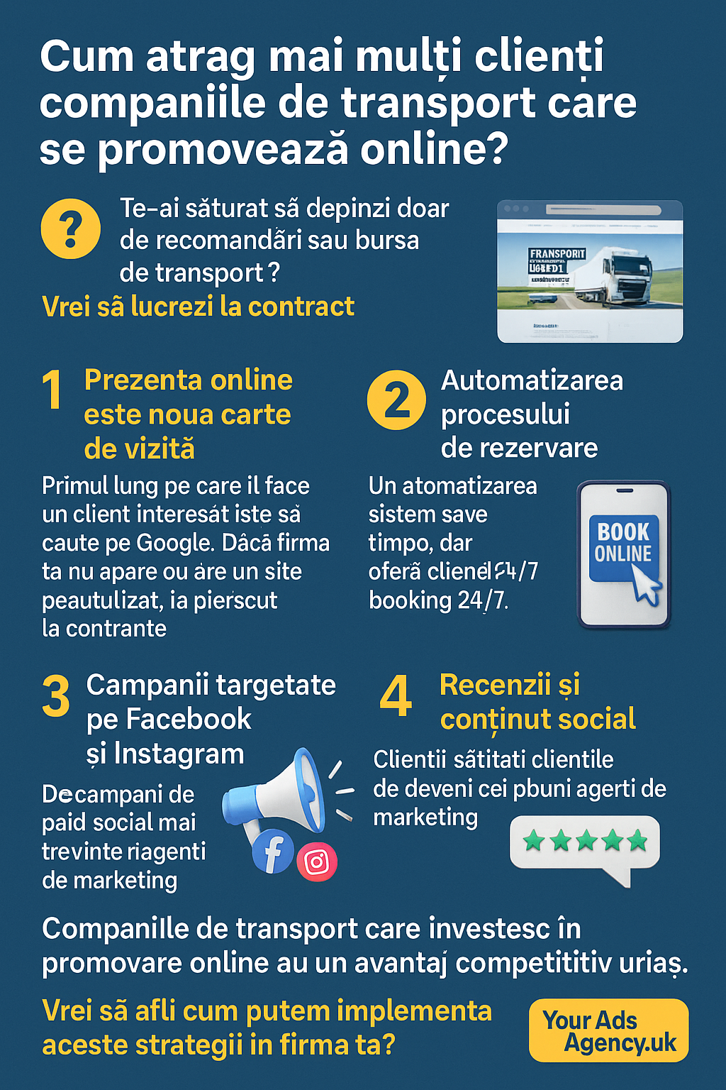 👉 Example: A simple ad saying “Need fast and secure transport for your business? Book online now!” can generate dozens of inquiries in one day.